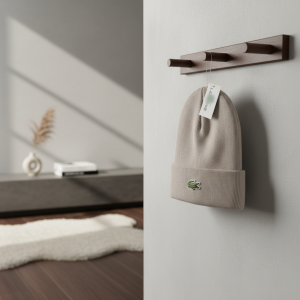 Lacoste Beige Knit Beanie, made from a soft cotton-blend fabric with a classic fold-over cuff, featuring the iconic crocodile logo for a timeless unisex look and effortless French urban style.