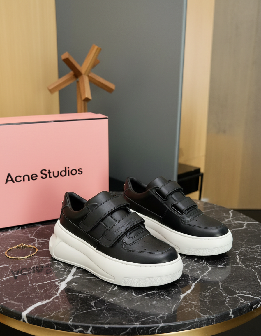 Acne Studios black leather velcro sneakers feature premium cowhide, smooth touch, bold white thick sole for height boost, minimalist Scandinavian design, unisex, stylish, comfy for daily urban wear.