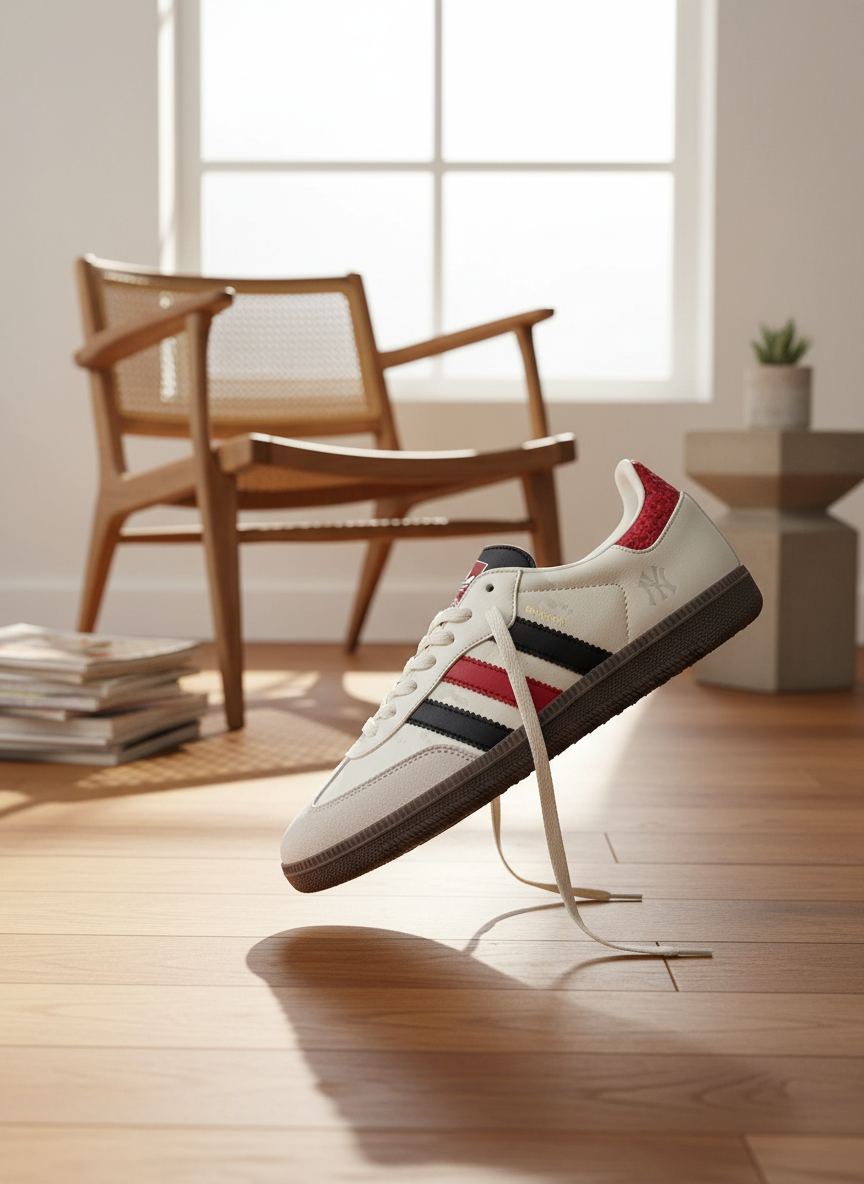 Adidas Classic Retro White Sneakers feature premium leather and suede panels, iconic red and blue stripes, a breathable rubber sole, and unisex streetwear style for everyday comfort and fashion.