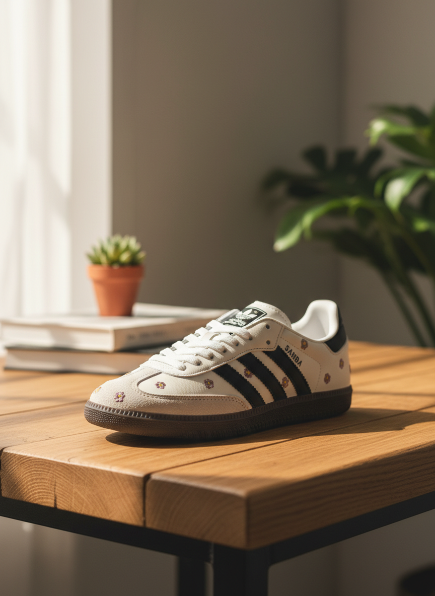 Adidas SAMBA White Floral Print Sneakers with iconic black stripes, premium leather and rubber sole, breathable comfort, vintage street style for men and women fashion wear.