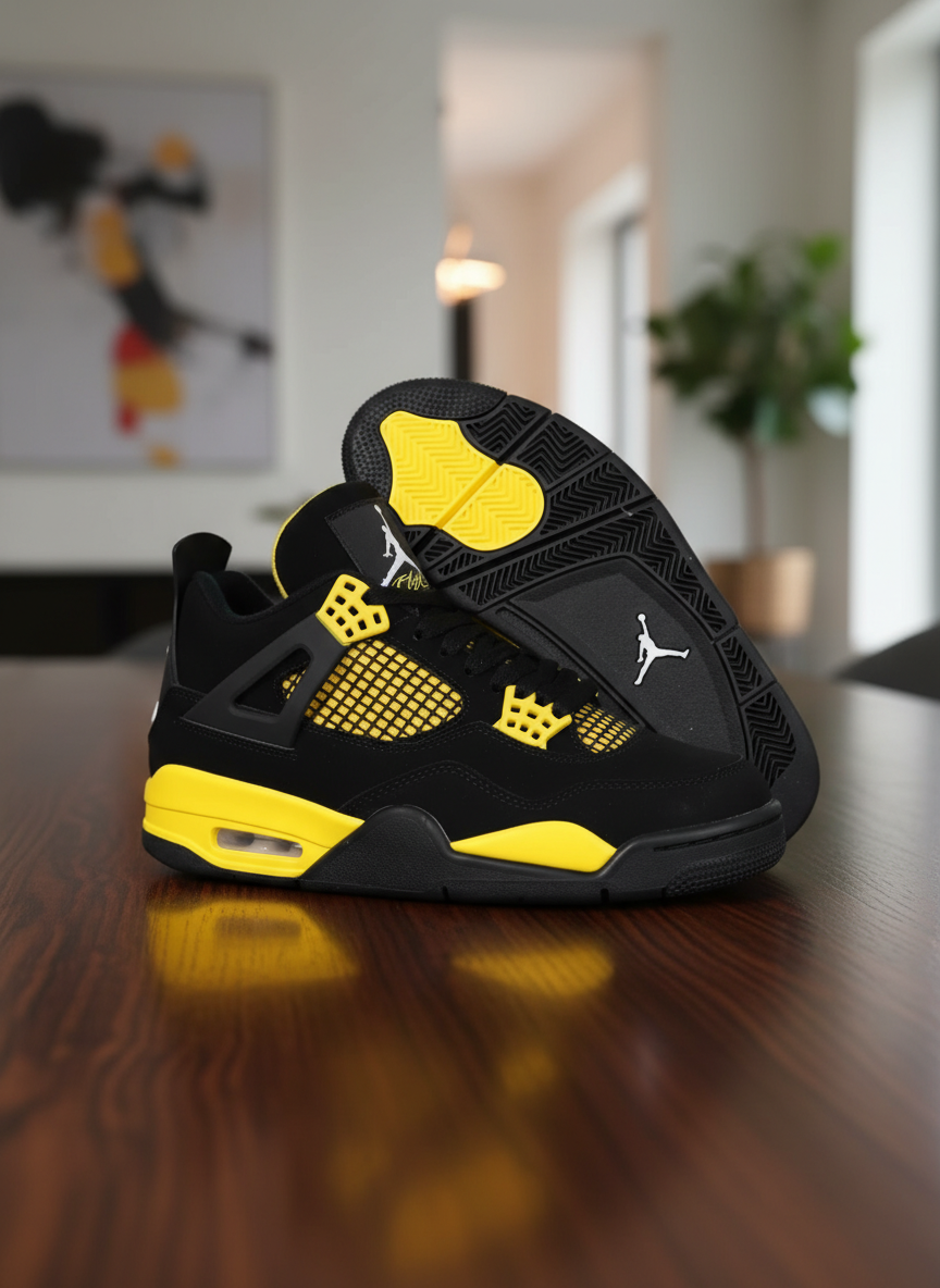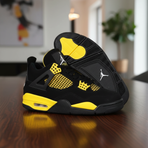 Air Jordan black and yellow basketball shoes feature premium leather with breathable mesh, visible Air cushioning, and retro street style. Unisex design blending classic energy with modern fashion.