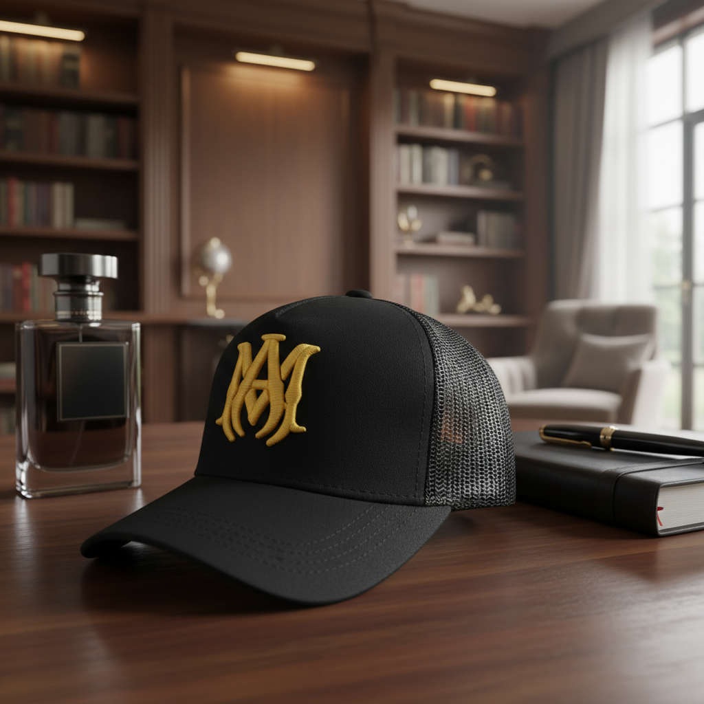 Amiri Black Embroidered Letter Baseball Cap with breathable mesh panels, 3D “AM” logo, unisex streetwear style, combining modern urban trend and casual comfort.