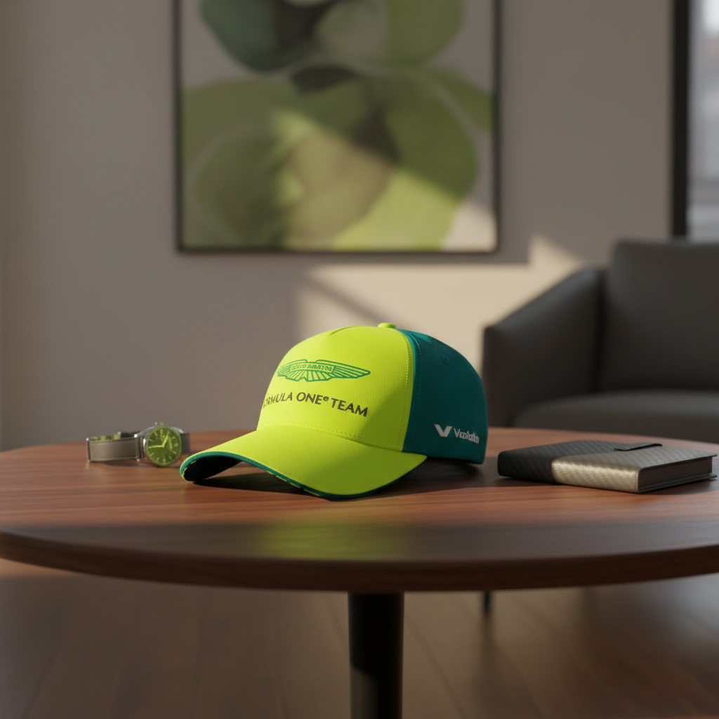 Aston Martin Red Bull Fluorescent Yellow-Green Racing Cap, breathable polyester, adjustable back strap, unisex design, showcases dynamic Formula One style and speed-driven aesthetics.