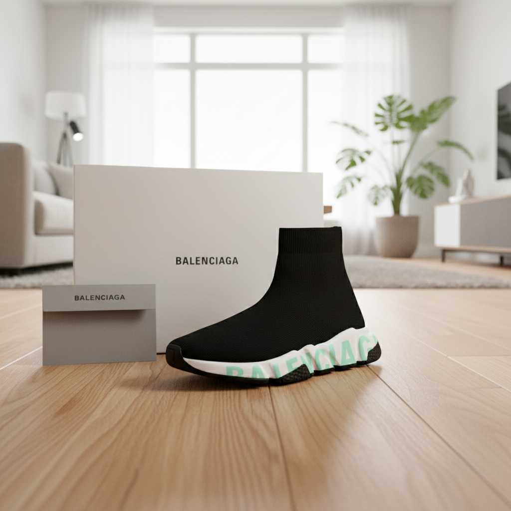 Balenciaga Speed Trainer Black Sock Sneakers feature stretch knit fabric, lightweight sole, green logo detail, unisex fit, and a minimalist futuristic design for modern urban style.