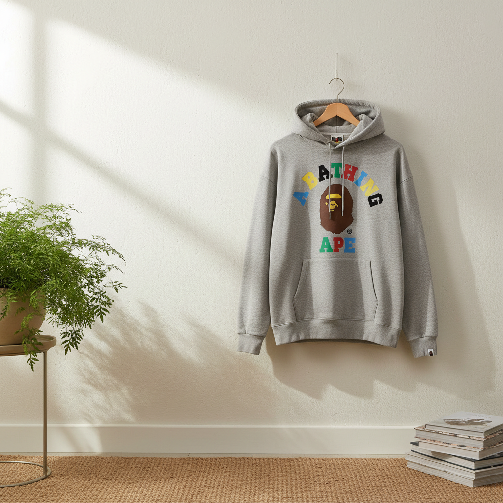 BAPE Grey Collaboration Hoodie – soft cotton fabric with colorful letters and iconic Ape Head print, classic streetwear style, loose fit for men and women, warm and stylish everyday wear.