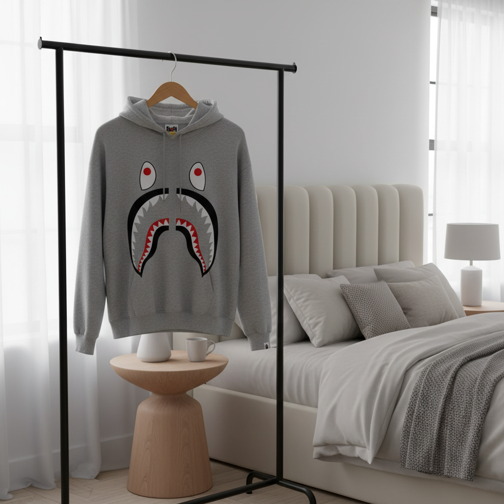 BAPE x Hoodies Grey Shark Hoodie, soft cotton fabric, iconic shark and ape head design, unisex loose fit, casual streetwear style for trendy everyday outfits.