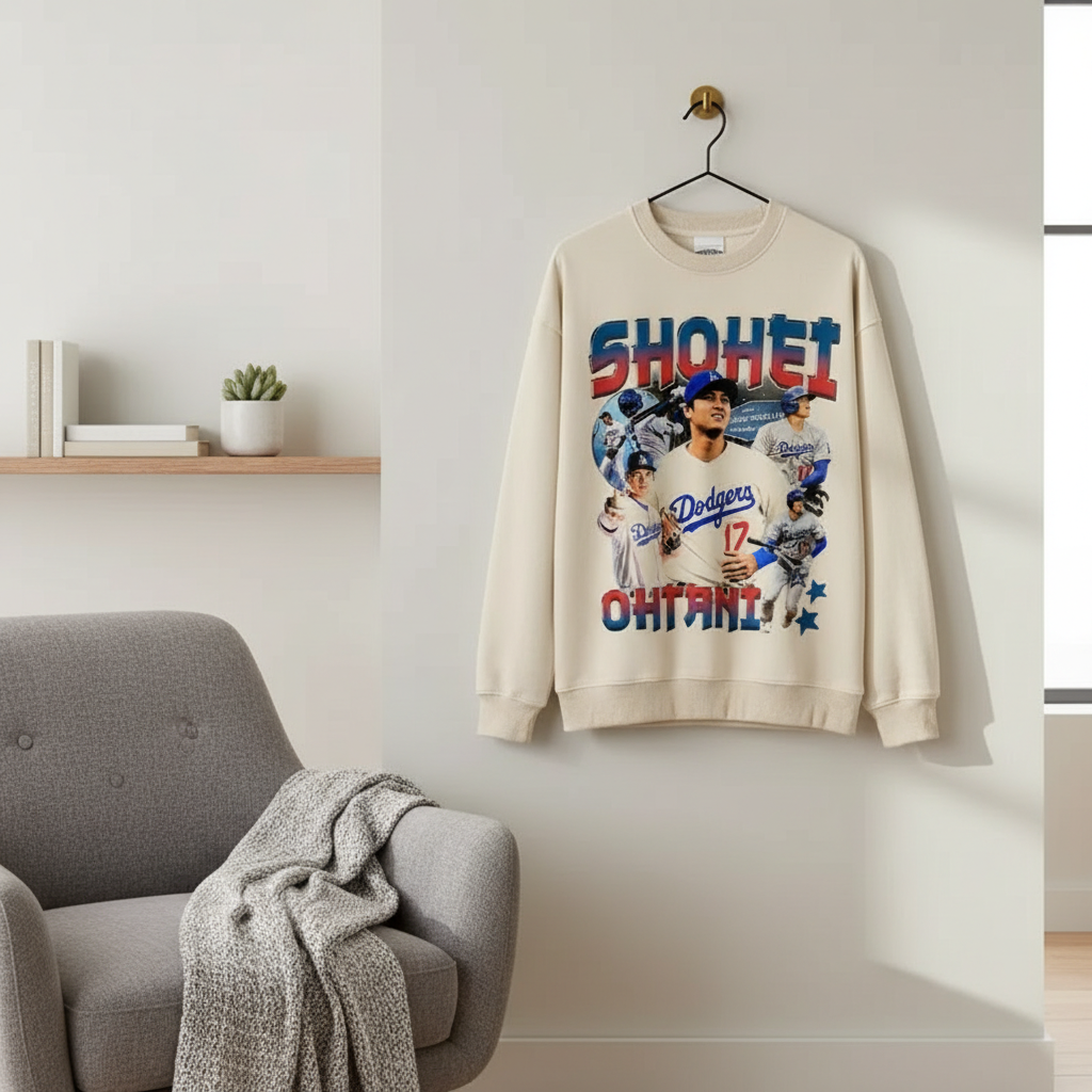 HoodiesOther beige baseball print sweatshirt, soft cotton fabric, bold “SHOHEI OHTANI” graphic with retro collage design, unisex loose fit, perfect for casual streetwear and sporty style.