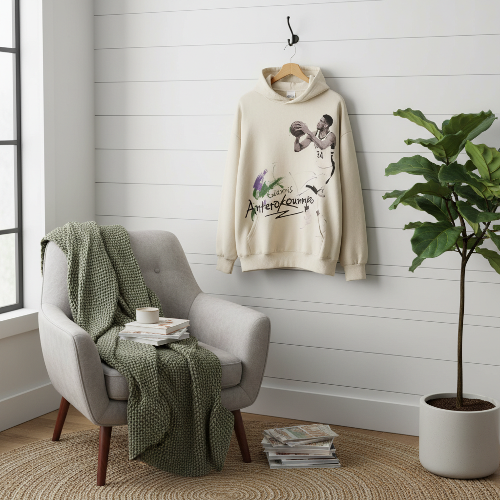 HoodiesOther Beige Basketball Hoodie, soft cotton fabric with relaxed fit, dynamic front print for sporty street style, unisex design offering warmth, comfort and trendy appeal.