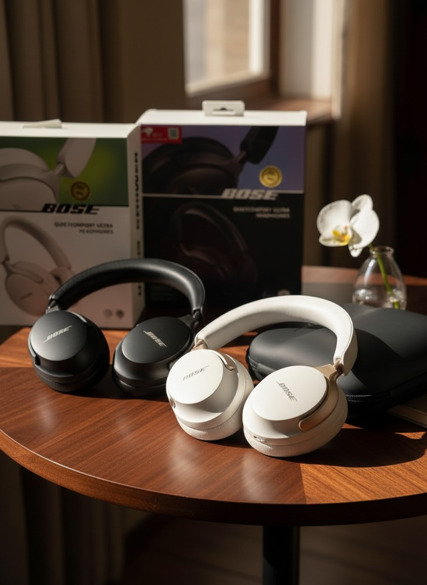 Bose QuietComfort Ultra Platinum Wireless Noise Cancelling Headphones with soft protein leather ear cushions and aluminum frames deliver immersive sound and a sleek modern design for all.