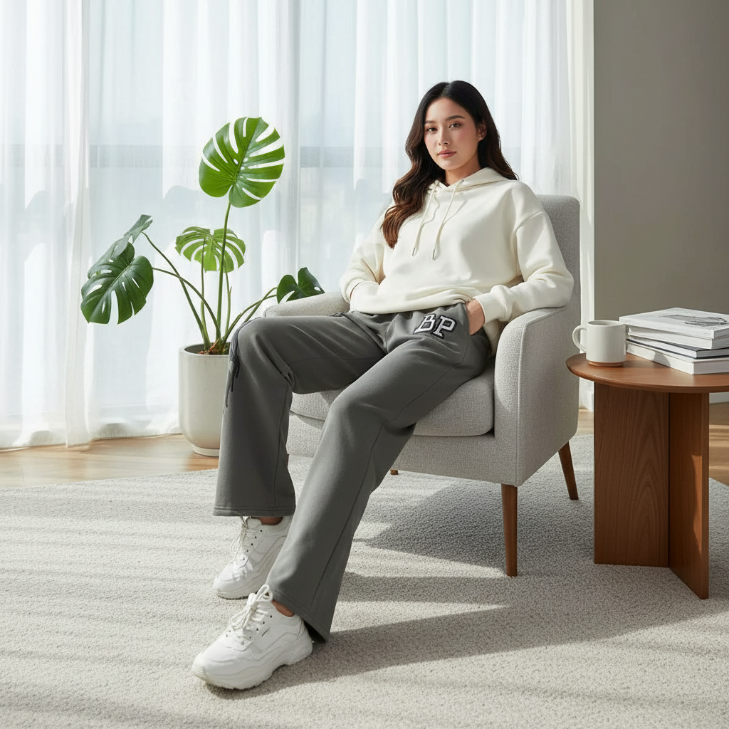 Broken Planet Grey Flame Print Loose Pants feature soft knit fabric, black flame motifs with BP logo, unisex streetwear style, comfy fit for casual fashion and bold urban attitude.