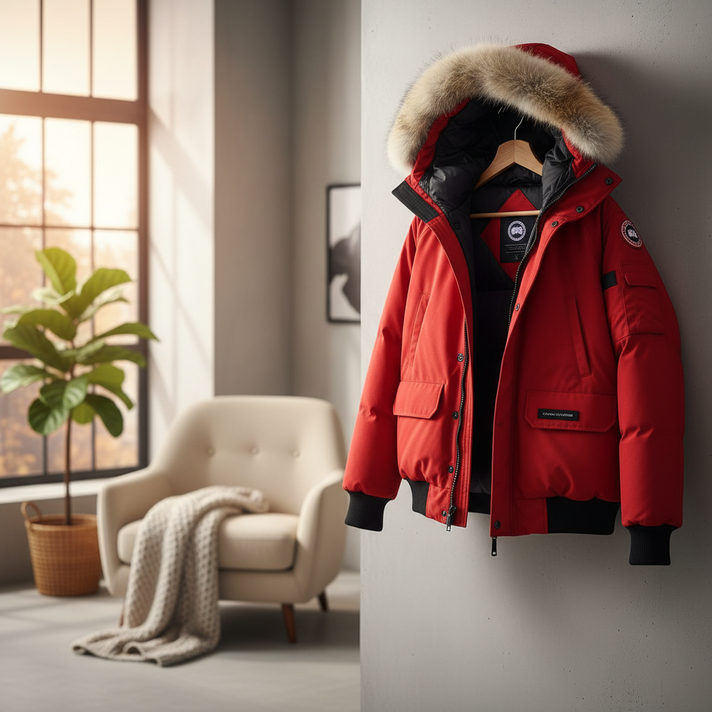 Canada Goose red short down jacket with windproof waterproof nylon, natural fur hood, classic bomber style for men and women, warm, lightweight, urban minimalist winter luxury.