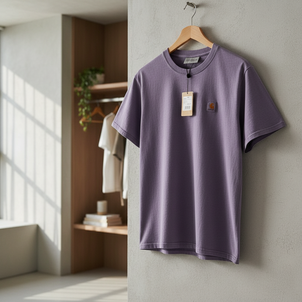 Carhartt vintage washed lilac T-shirt, made of soft cotton fabric with classic logo patch on chest, relaxed unisex fit, showcasing casual American workwear style for everyday versatile wear.