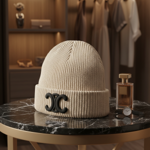 Celine Beige Wool Knit Hat with soft warm texture and embossed Double C logo, showcasing French minimalist style. Unisex design ideal for fall and winter street fashion with a modern luxury vibe.