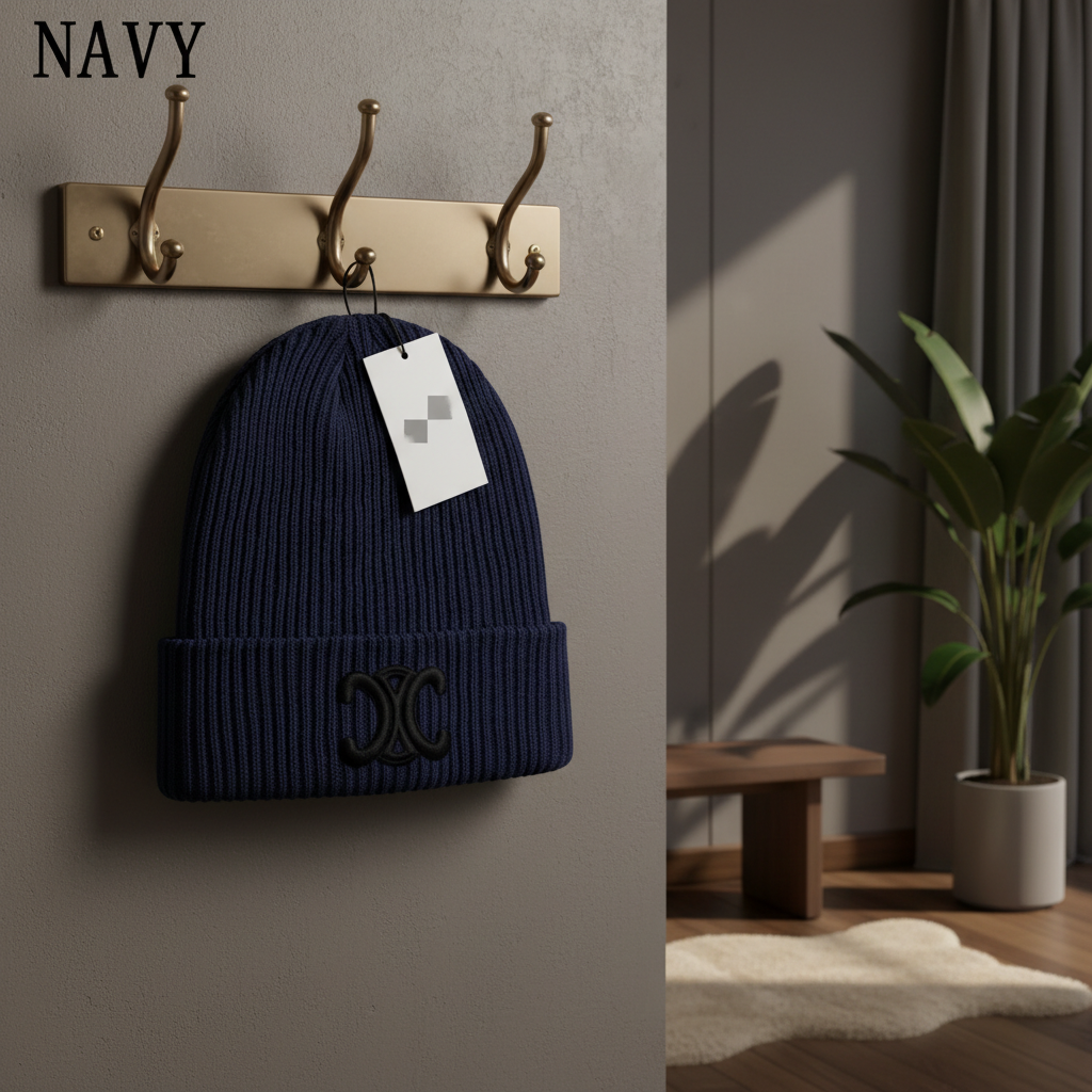 Celine Navy Knit Beanie crafted from a soft wool blend, features embroidered logo on front, minimal French design, unisex style, warm and comfortable, elevating luxury casual fashion.