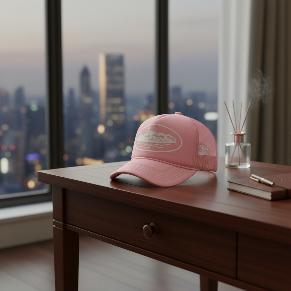 Corteiz Pink Mesh Baseball Cap crafted from breathable polyester panels, featuring signature landmark graphic, vintage streetwear vibe, unisex fit, lightweight comfort, bold and trendy style.