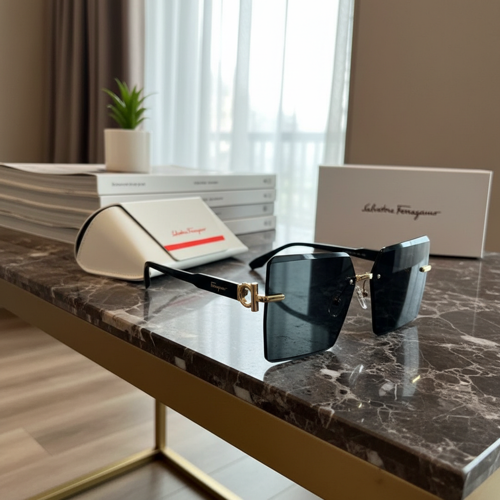 Salvatore Ferragamo black square sunglasses combine metal and acetate with signature Gancini hinge detail. Sleek UV-protection lenses offer unisex elegance and timeless Italian luxury.