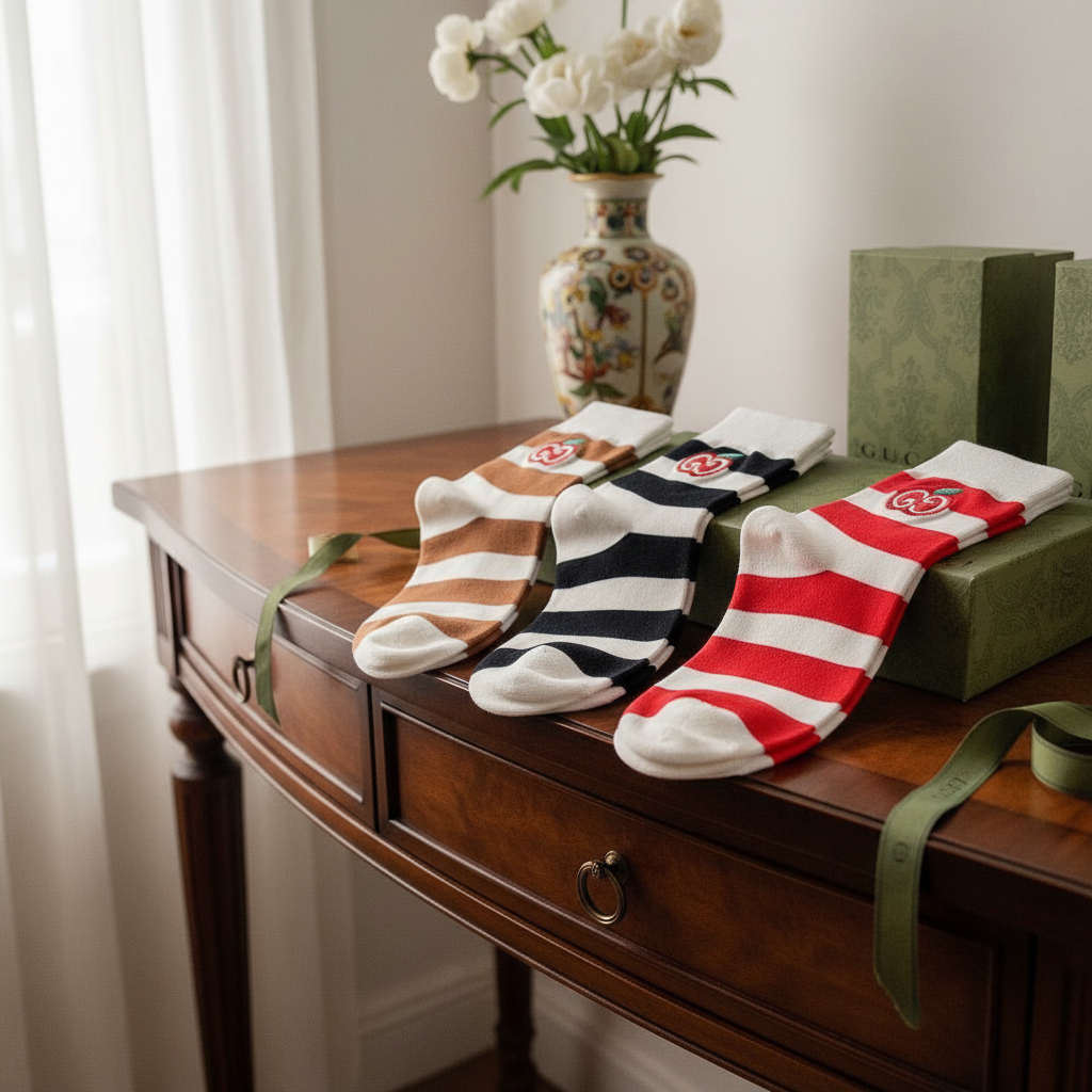 Gucci Classic Brown and White Striped Socks made from soft cotton, featuring iconic Double G Cherry embroidery. Retro preppy style, unisex, stylish and comfortable for daily casual wear.