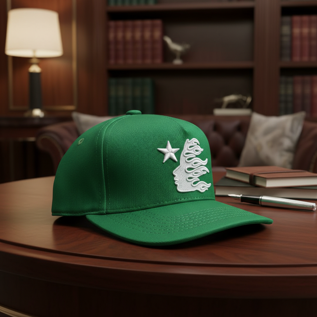 Hellstar Green Embroidered Flame Star Baseball Cap, made from high-density twill cotton, structured six-panel design, unisex streetwear style, showcasing bold brand attitude and trendy edge.