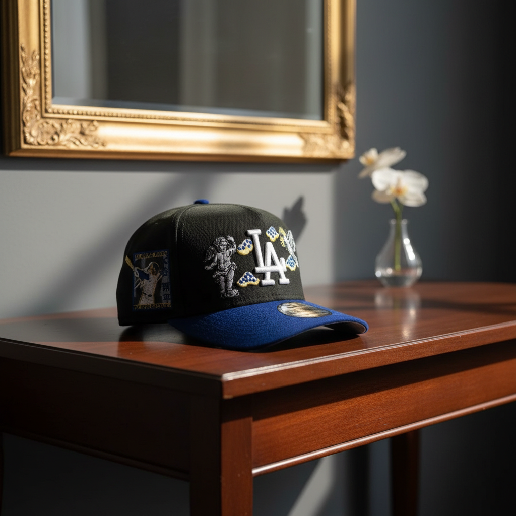MLB black and blue baseball cap made of high-density cotton, featuring 3D embroidered angel and dove motifs with iconic letter logo, six-panel curved design, breathable, unisex, vintage street style.