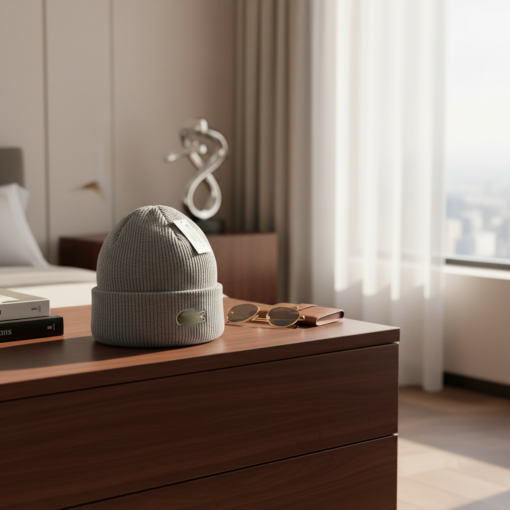 Lacoste Classic Grey Knit Beanie, made from a soft cotton blend with minimalist cuff and iconic crocodile logo, unisex design offering French sporty style, warmth, comfort, and timeless fashion.