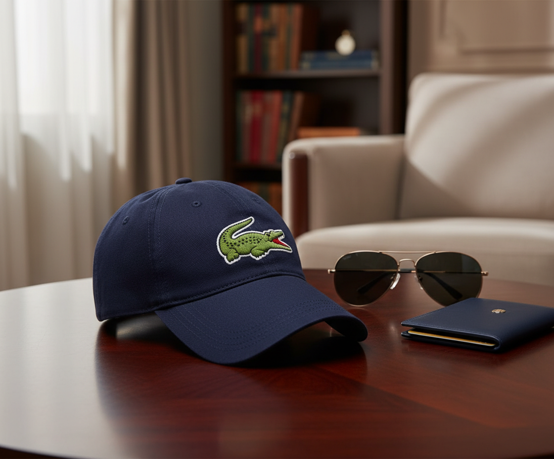 Lacoste navy blue casual baseball cap made of premium cotton twill, featuring 3D crocodile embroidery logo, unisex sporty design, breathable and comfortable, showcasing effortless French elegance.