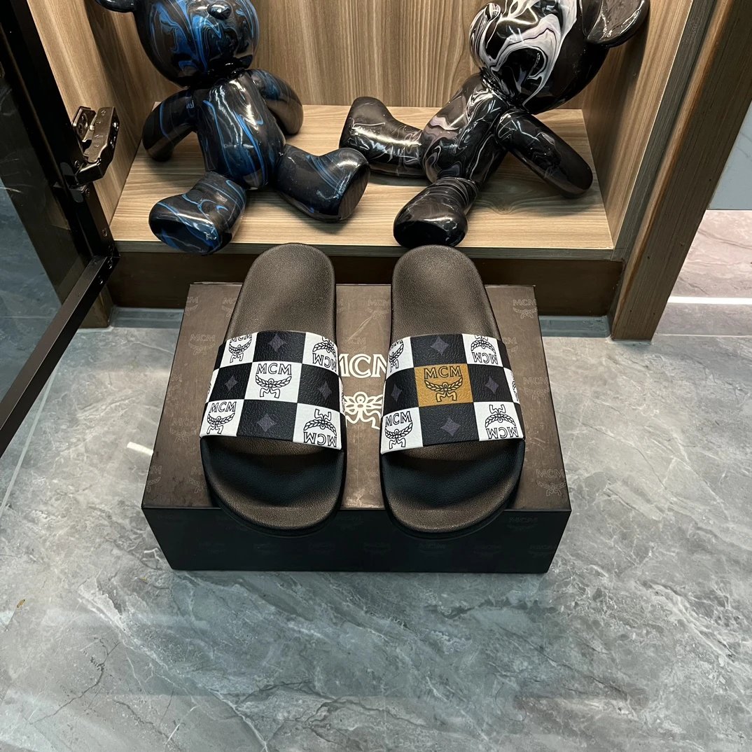 MCM Checkerboard Logo Slides feature premium supple leather with iconic Visetos pattern, unisex design, black sole for luxe feel, anti-slip comfort perfect for travel and casual style.