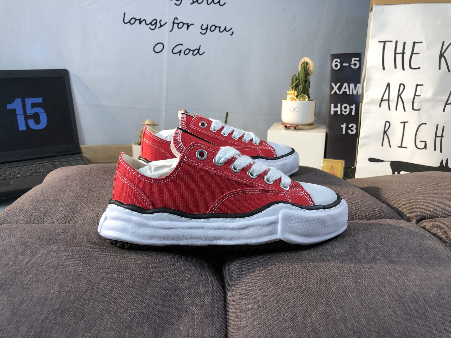 Maison Mihara Yasuhiro red platform canvas sneakers with premium cotton upper and deconstructed rubber sole, unisex design, breathable comfort, vintage street meets modern avant-garde style.