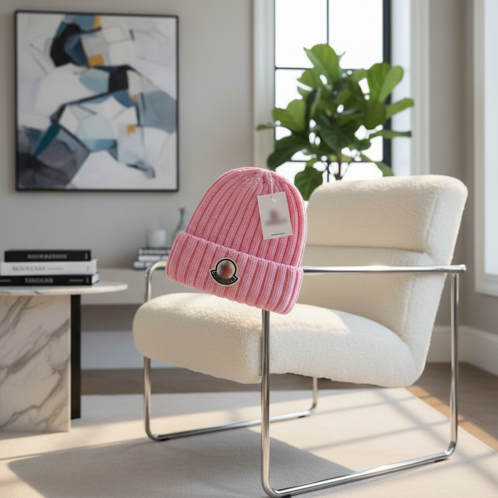 Moncler Pink Wool Knit Beanie – soft, warm, and delicately textured, featuring the iconic Moncler logo embroidery. A unisex winter essential that blends luxury and casual elegance.