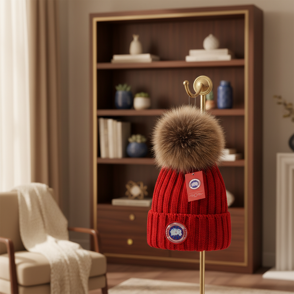 Moncler Red Knit Hat crafted from soft wool blend with luxurious real fur pom, ribbed texture for classic French style, warm and chic winter accessory for men and women, street luxury fashion.