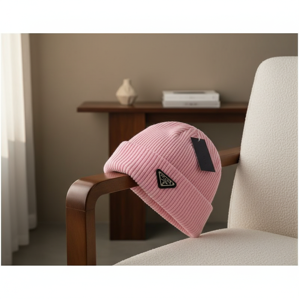 Prada Pink Knit Wool Blend Beanie, soft, warm, and comfortable. Features fine ribbed texture and signature triangular logo. Unisex design, perfect for winter street and casual style.