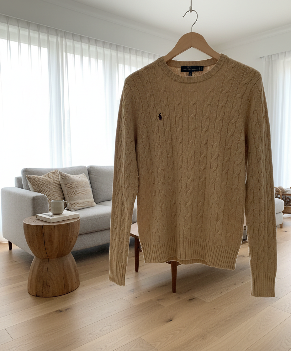 Ralph Lauren Classic Light Camel Wool Cable Knit Sweater, soft, warm, and timeless, unisex design with effortless American casual style and refined elegance for everyday wear.