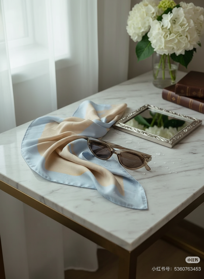 CHANEL Silky Light Blue Beige Patchwork Scarf, crafted from fine silk for a smooth texture, wide design offers versatile styling, exuding French elegance and soft luxury for spring and summer.