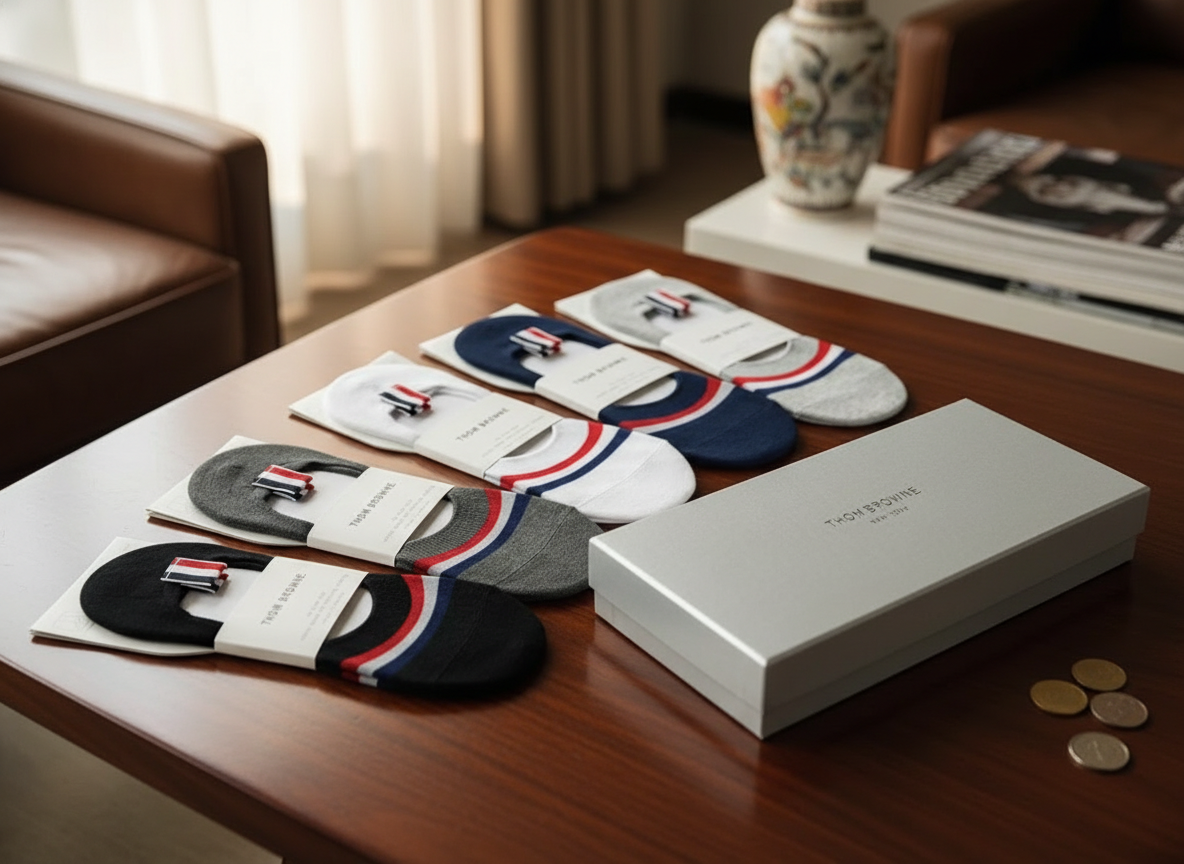 Thom Browne black invisible socks with red and blue stripes, soft cotton blend, breathable and non-slip, classic tricolor band design, versatile unisex style, refined American casual look.