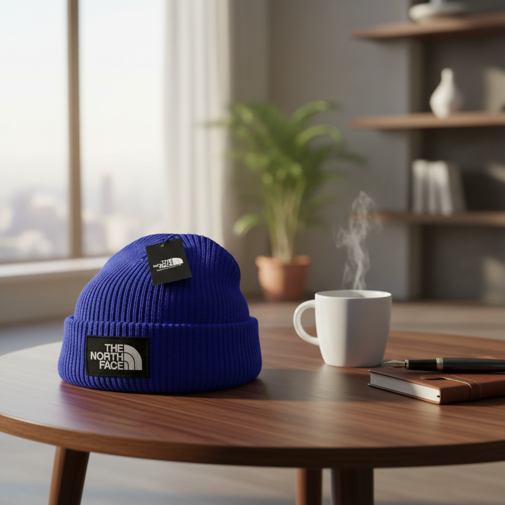 The North Face blue knitted beanie features soft ribbed design, premium acrylic fabric, cozy warmth, classic logo patch, unisex style, ideal for fall winter commuting, travel, and casual wear.