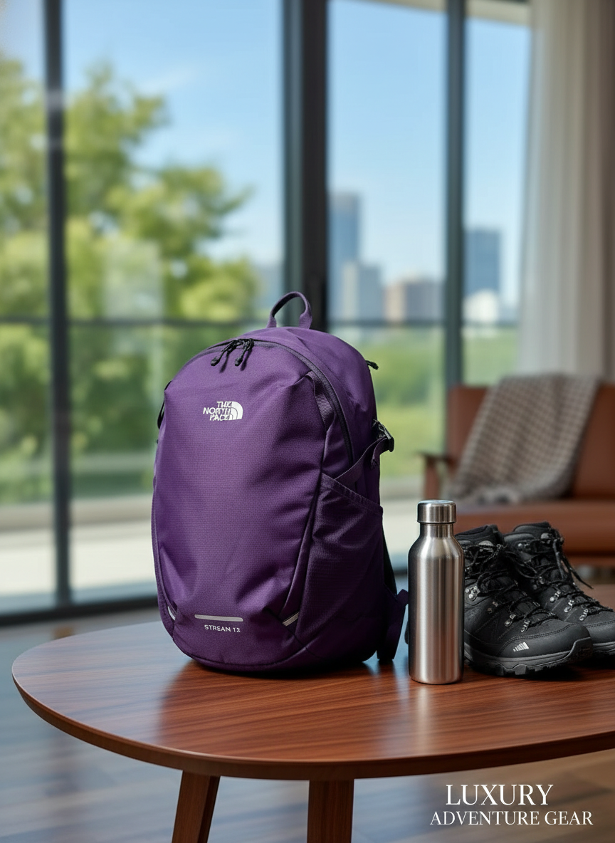 The North Face Purple STREAM 12 Backpack features water-resistant nylon, ergonomic design, and multi-layer storage. Lightweight and durable for commuting, travel, and outdoor adventures.