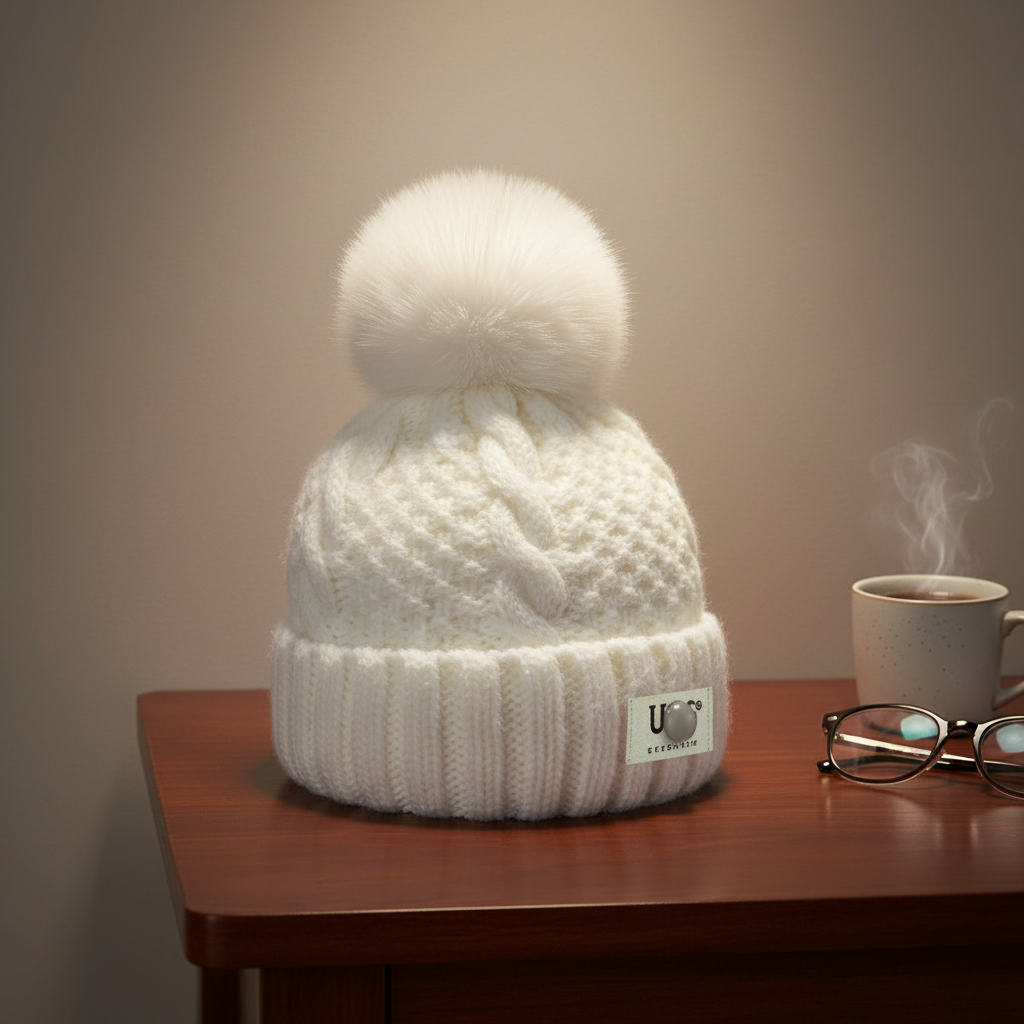 UGG White Wool Knit Pom Hat – made of thick soft yarn and plush lining for ultimate warmth and comfort. Unisex winter style with minimalist design for a cozy, chic, and premium look.