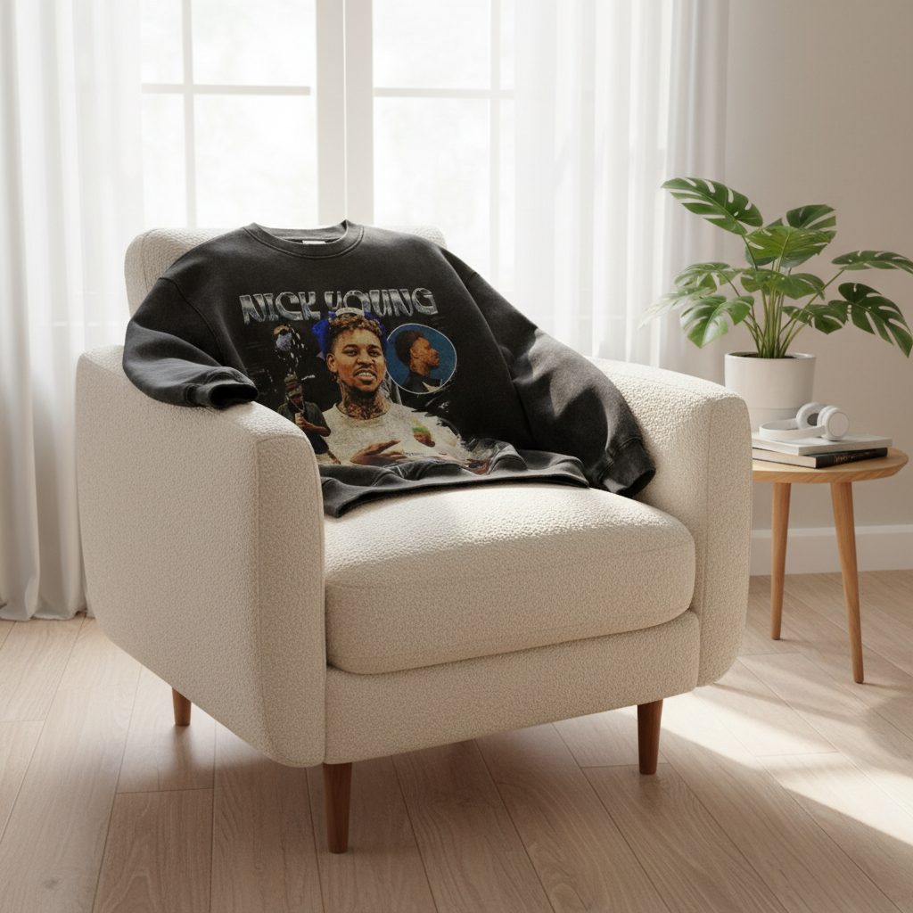 HoodiesOther Vintage Washed Black Graphic Sweatshirt, loose drop-shoulder fit, metallic letter print with artistic figure design, soft cotton fabric, unisex streetwear style for autumn and winter outfits.