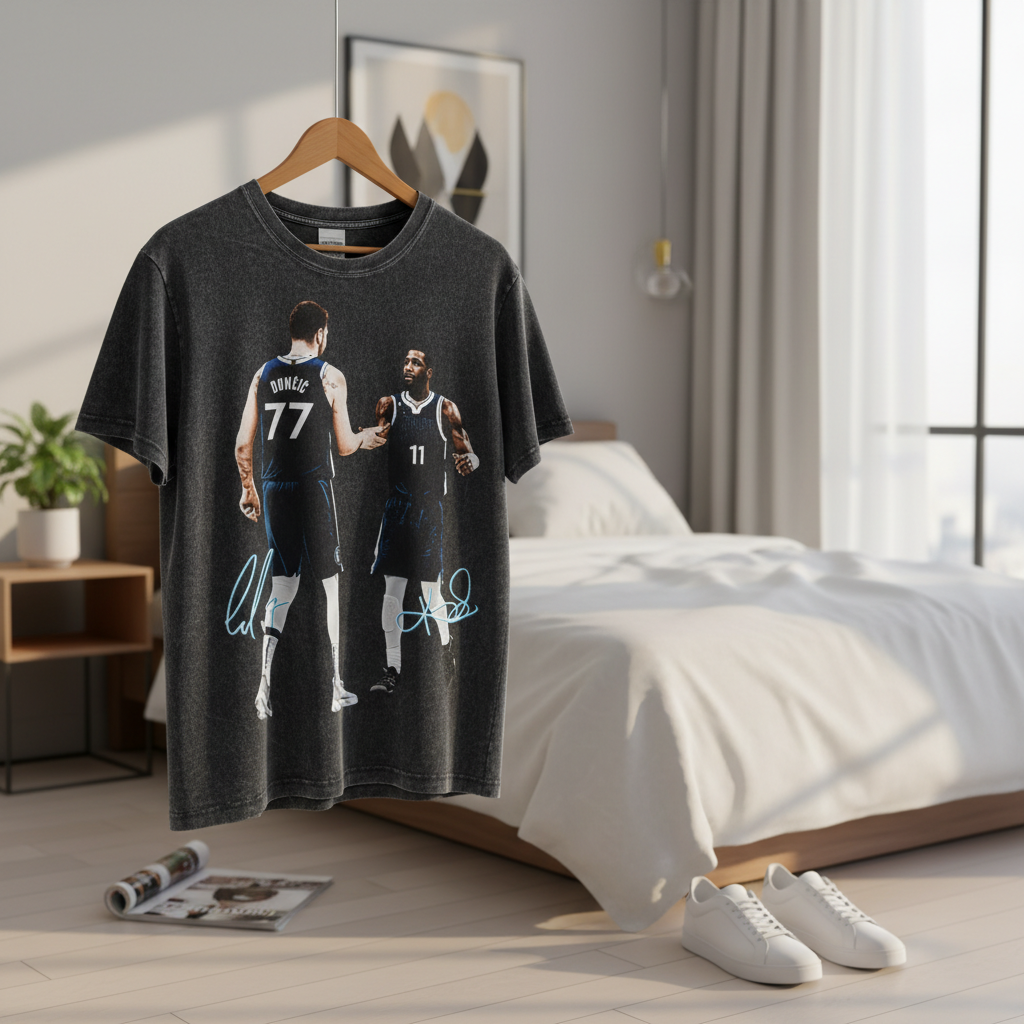 Miaoxuehua Vintage Washed Black Basketball Print T-Shirt, loose fit, soft breathable cotton, twin player back design with signature graphic, unisex street style for sporty casual looks.