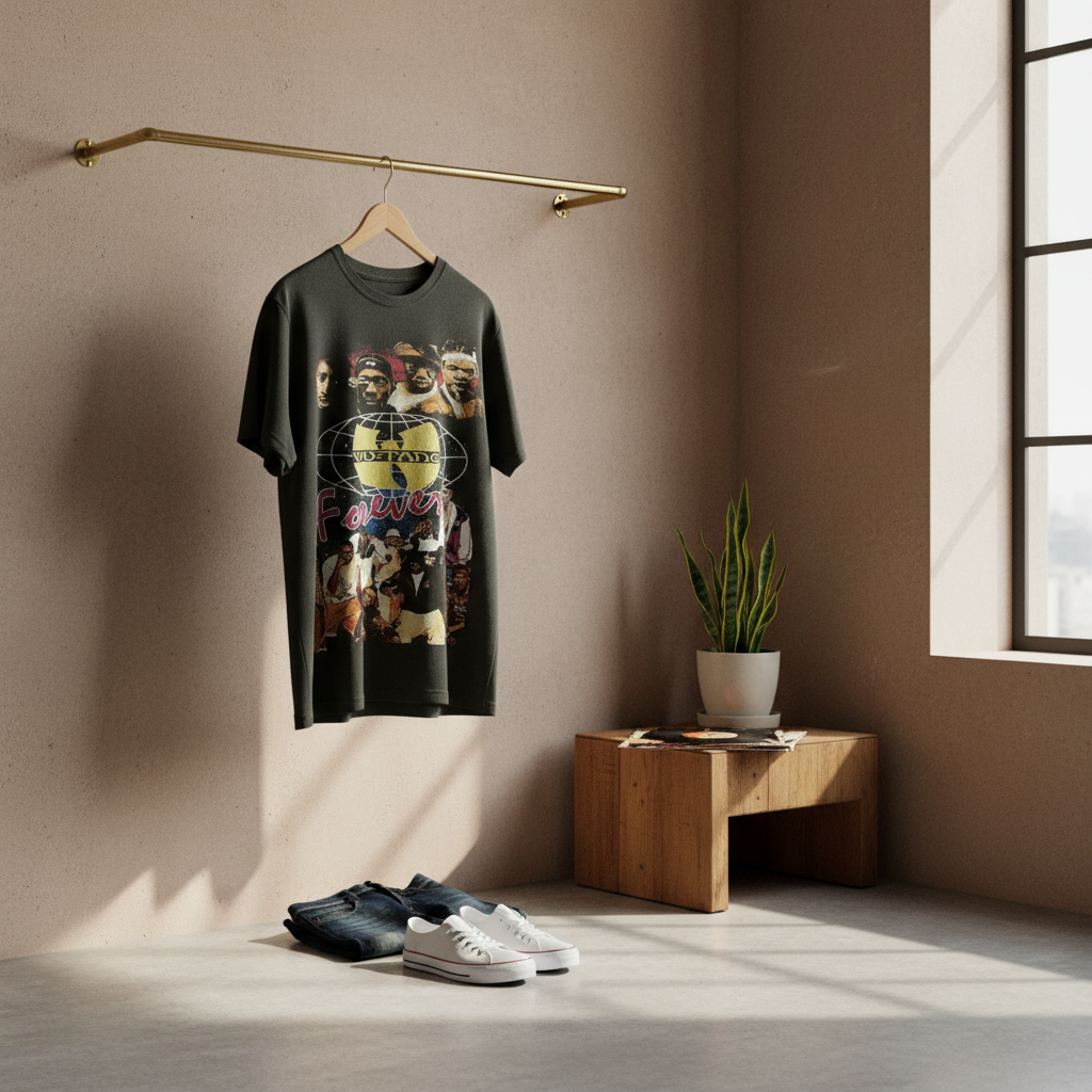 WU-TANG Forever Vintage Black Graphic T-Shirt, inspired by 90s hip-hop street culture. Made from premium cotton, soft, breathable, and unisex with a relaxed fit for effortless retro street style.