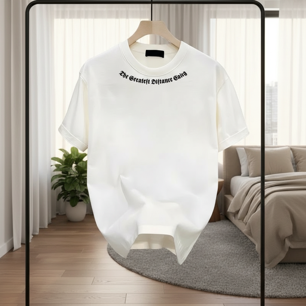 Other White Minimalist Print T-Shirt, made from soft pure cotton. Features black gothic lettering on neckline for artistic flair. Loose unisex fit, breathable and comfy streetwear for casual minimalist style.